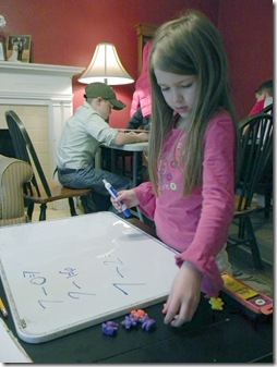 She is also learning her math facts and had a fun time playing a game against me using number cubes (ie. dice – during my school teacher days we weren’t supposed to say dice hence the number cubes).
