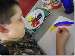 Everyone wanted to get in on the color mixing. It made me realize that the older boys need to make a color wheel in the future. They had fun mixing a lot of colors from just the three primary colors.